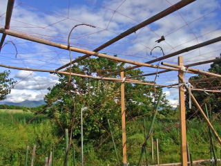 杭を打ち、角材、竹を縛りつけて作りました。ネットを張っていま