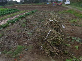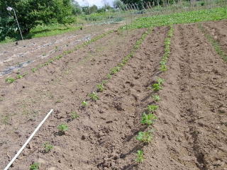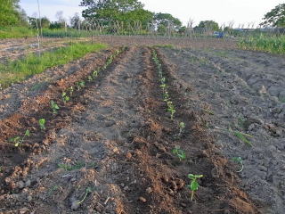秘伝豆、定植完了です。雑草を取りながらの作業となってので