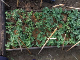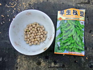 お盆に仏壇に供える夏豆の栽培補方である。若芽が野鳩に突かれるので、ネットで内で発芽させある程度大きくなってから定植している。