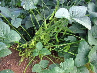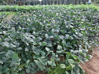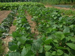 秘伝豆、こんなに大きくなりました。左側畝はキャベツです。