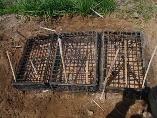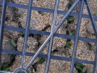 野鳩よけにホームセンターから頂いた苗カゴをを置き、葦棒で