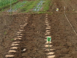 @良く耕した地面に深さ10センチメートル程度の溝を掘ります。