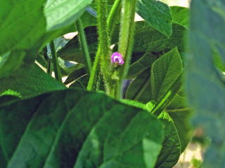 秘伝豆の花確認です。赤っぽい紫の花です。