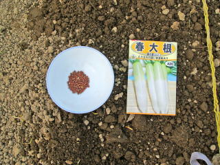 蒔きます。1袋420円でした。春大根とありますが「春蒔き」