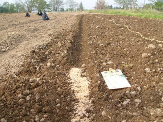 三角鍬で溝切りし、一粒ずつ蒔き、溝を崩すようにして土を