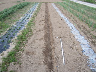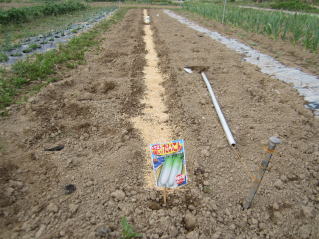 三角鍬で溝を切る。深さ3センチ程度。2022.04..26 5:22 |
