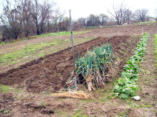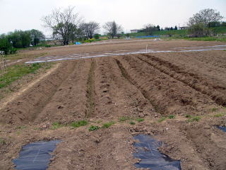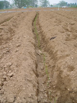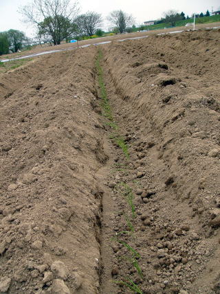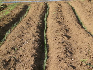 よく耕した地面に深さ20センチくらいの溝を鍬で掘ります。畝幅は作業を考慮し1メートル位でしょうか。