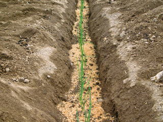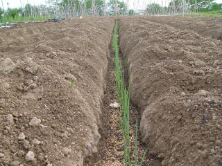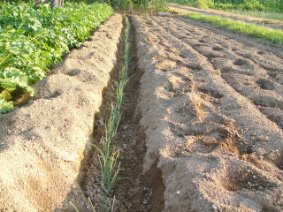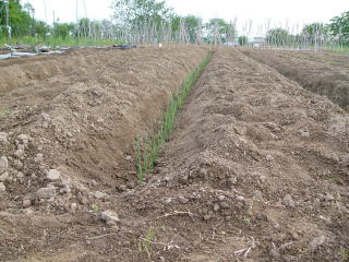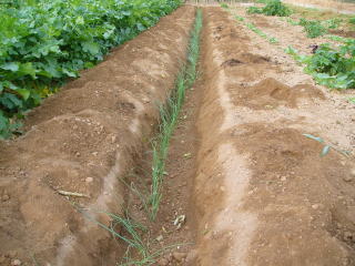よく耕した地面に深さ20センチくらいの溝を鍬で掘ります。畝幅は作業を考慮し1メートル位でしょうか。