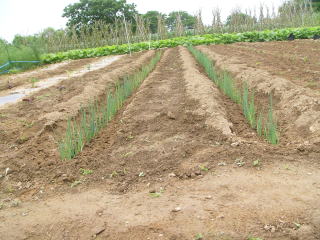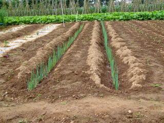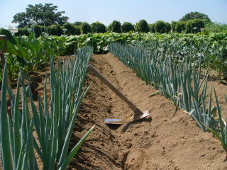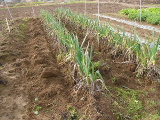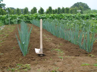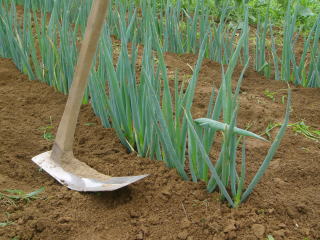雑草を取り、ネギの根元の片方を鍬で土掘ります。こうする
