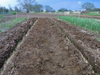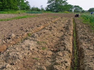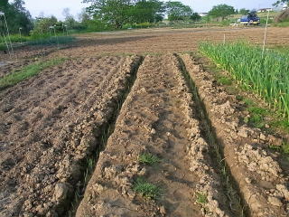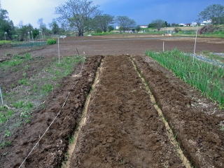 よく耕した地面に深さ20センチくらいの溝を鍬で掘ります。畝幅は作業を考慮し1メートル位でしょうか。