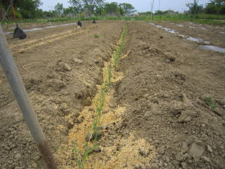 よく耕した地面に深さ20センチくらいの溝を鍬で掘ります。畝幅は作業を考慮し1メートル位でしょうか。