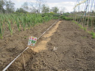 @良く耕した地面に深さ3センチメートル程度に、深さ約3センチの溝をV字状に掘ります。