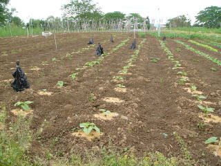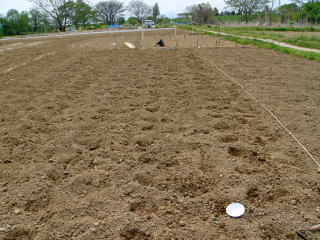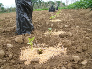 @良く耕した地面に移植べらで約30〜45センチ間隔で、直径約6センチメートル、深さ3〜4センチメートルの穴を掘ります。