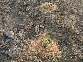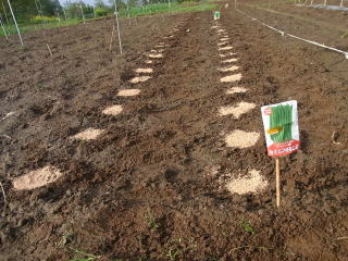 @良く耕した地面に移植べらで約30〜45センチ間隔で、直径約6センチメートル、深さ3〜4センチメートルの穴を掘ります。