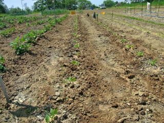収穫まで2回程度顆粒状合成肥料をパラッと根の周りに蒔いています。その時、両脇から土をかけて盛り上げ状態にします。おらホではこの作業を「サクヅガケ」と称しています。