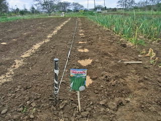 @良く耕した地面に移植べらで約30〜45センチ間隔で、直径約6センチメートル、深さ3〜4センチメートルの穴を掘ります。