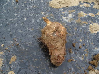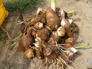 スコップで根を掘り起こしてみました。子芋が握り拳ほどに