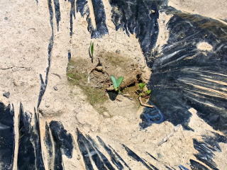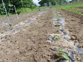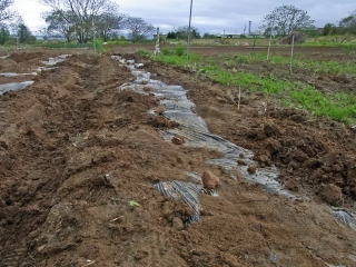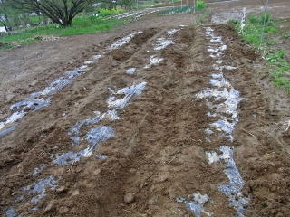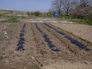 よく耕した地面に幅3〜4尺のマルチ(黒い農業用ビニール)を敷き、固定します。マルチの敷き方にはコツがありますが、おらホでは風のない早朝にしています。