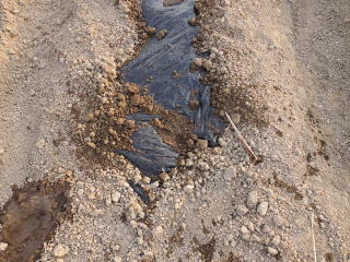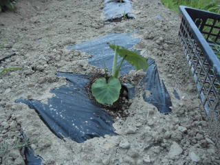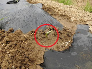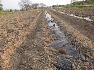 よく耕した地面に幅3〜4尺のマルチ(黒い農業用ビニール)を敷き、固定します。マルチの敷き方にはコツがありますが、おらホでは風のない早朝にしています。
