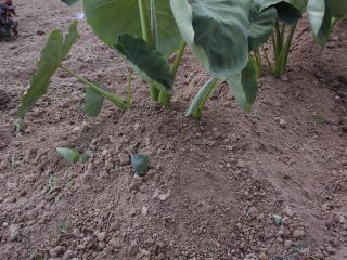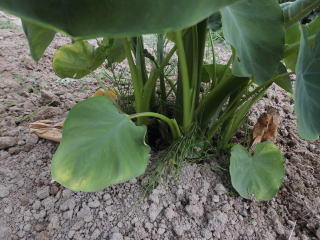 8月初旬頃芋の茎、葉が大きくなったら数本残し、残りの茎を間引き切り落とします。切り落とした茎、葉は茎の周りに置き土で埋めます。(肥料になる?昔からそうしています。)