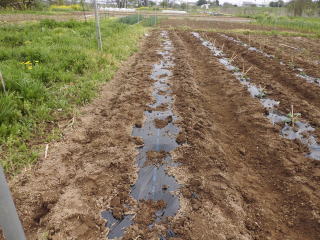 よく耕した地面に幅3〜4尺のマルチ(黒い農業用ビニール)を敷き、固定します。マルチの敷き方にはコツがありますが、おらホでは風のない早朝にしています。