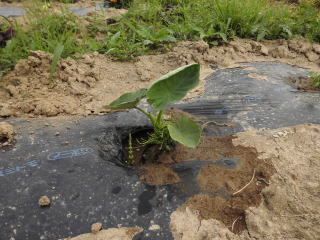 サトイモらしい葉っぱが出てきました。サトイモは水掛が肝心です。