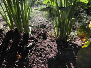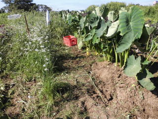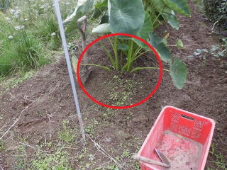 8月初旬頃芋の茎、葉が大きくなったら数本残し、残りの茎を間引き切り落とします。切り落とした茎、葉は茎の周りに置き土で埋めます。(肥料になる?昔からそうしています。)