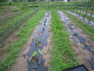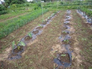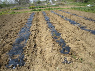 | 間隔60センチ程度にして仮置きの状態。畝幅1メートル程度。2019.05.03 9:15 | 穴開け機でマルチを穴を開け、芽が上になるようにして植え付け完了。2019.05.03 9:40 | ||||||||||||||||||||||||||