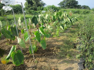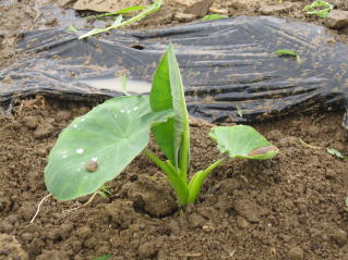 | 山形名物「エモニカイ」(おらホではなまって芋煮会を意味する)のメイン材料となる里芋の栽培方法の紹介です。里芋の苗木はホームセンター1本150円前後と高価です。おらホでもこれまで苗木を購入して栽培していましたが、昨年から種芋から栽培して見事成功し、相応の成果を得ることが出来ました。 定植の準備 よく耕した地面に幅3〜4尺のマルチ(黒い農業用ビニール)を敷き、固定します。マルチの敷き方にはコツがありますが、おらホでは風のない早朝にしています。 定植時期 さすが山形名物「エモニカイ」の古里。昔で言う八百屋と称する所の殆どの店舗で購入することが出来ますが、店毎に仕入れルート が違うようで当たりはずれもあるようです。 おらホでは4月末から八百屋、ホームセンター店頭にナス、キュウリ等ともに種芋が並び始めます。これを買い求めて5月1日前後に定植しています。 定植の仕方 @1畝中約60センチ間隔となるように15センチの深さとなるように穴開け器で穴を開けていきます。 A@に水を注ぎます。 B芽の出る方が上になるよう穴に置き、厚さ5センチくらいになるように周りの土で埋め固定します。 C昨年は、20日前後で芽が出ました。 手入れ 基本的にはほったらかしですが、乾燥には弱いようです。 肥料 芽が出たら第1回目は市販の顆粒状合成肥料をパラパラとかけ周りの土を土を寄せています。(サクヅカゲ) 20センチくらいになったら「尿素」「顆粒状合成肥料」をかけサクヅカゲ 茎落とし(茎の間引き) 8月初旬頃芋の茎、葉が大きくなったら数本残し、残りの茎を間引き切り落とします。切り落とした茎、葉は茎の周りに置き土で埋めます。(肥料になる?昔からそうしています。) マルチ撤去 お盆頃になっったらマルチを撤去し、通気がよくなるようにしています。 ポイント 遅霜の被害を避けるため、土を多めにかけ発芽が遅くなるようにしています。洪水には強いようです。 収穫 9月中旬頃から収穫できました。適宜順次好きなところから収穫していますが、10月下旬には全部収穫し、冬に備え保存します。 調理 ナント言ってもエモニジル(芋煮汁)でしょう。納豆汁、けんちん汁の具にも最適です。イカとドッキングさせての煮っ転がしも結構いけます。 |