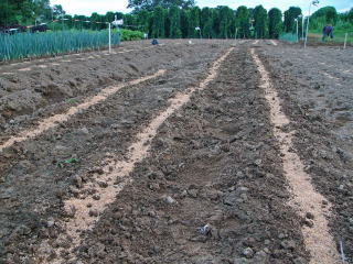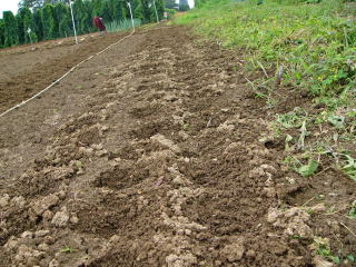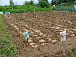 @良く耕した地面に1畝60センチくらいにし、ここに直径10センチほどの窪みを2  から3個ずつ30センチ間隔につくり手の甲で平らにします。