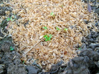 B軽く土をかけ、この上に籾殻を蒔きます。籾殻は土の固定と保水の効果が有るようです。
