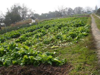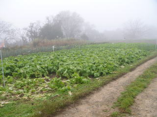 朝靄の中の山形青菜(せいさい)。だいぶ大きくなりました。