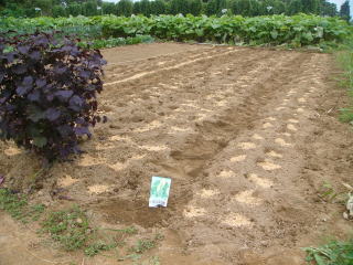 @良く耕した地面に1畝60センチくらいにし、ここに直径10センチほどの窪みを2 から3個ずつ30センチ間隔につくり手の甲で平らにします。
