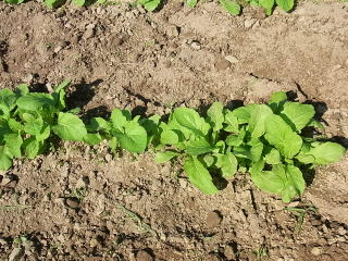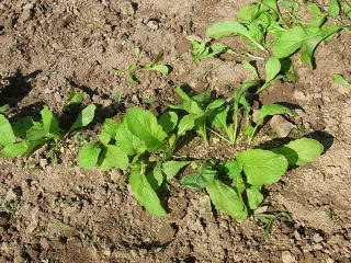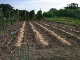@良く耕した地面に1畝60センチくらいにし、ここに直径10センチほどの窪みを2 から3個ずつ30センチ間隔につくり 手の甲で平らにします。