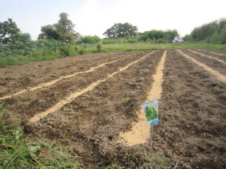 @良く耕した地面に1畝60センチくらいにし、ここに直径10センチほどの窪みを2 から3個ずつ30センチ間隔につくり 手の甲で平らにします。