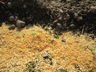 B軽く土をかけ、この上に籾殻を蒔きます。籾殻は土の固定と保水の効果が有るようです。