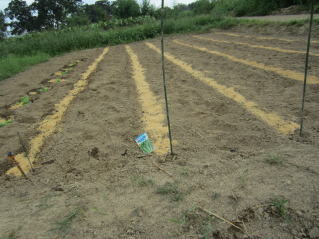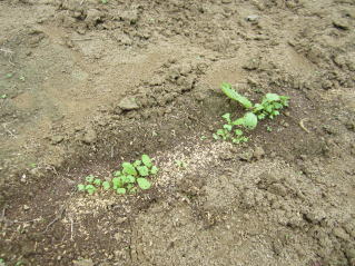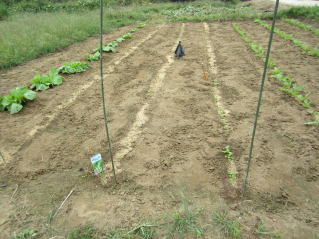 @良く耕した地面に1畝60センチくらいにし、ここに直径10センチほどの窪みを2 から3個ずつ30センチ間隔につくり 手の甲で平らにします。