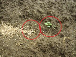 B軽く土をかけ、この上に籾殻を蒔きます。籾殻は土の固定と保水の効果が有るようです。