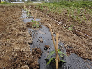 よく耕した地面に幅3〜4尺のマルチ(黒い農業用ビニール)を敷き、固定します。マルチの敷き方にはコツがありますが、おらホでは風のない早朝にしています。