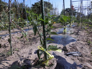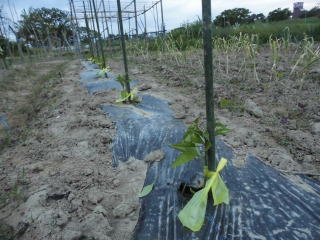 おらホでは4月末からホームセンター店頭にナス、キュウリ等ともに苗が並び始めます。これを買い求めて5月1日前後に定植しています。おらホでは数本買い求めています。