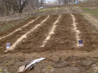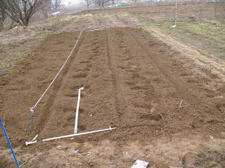 @良く耕した地面に鍬等で約5センチメートルのV字の溝を作ります。5センチは経験上です。