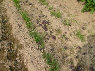 3センチくらいになったところで濃く蒔いたところを間引きします。間引きしないと幹が細くて葉っぱがいっぱいつきません。おらホの農園では雑草とナカナカ見分けがつかず悪戦苦闘します。