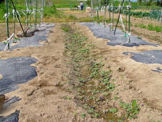 左はニラの2畝の間に発芽した赤シソ、右はキュウリマルチの間に発芽した青シソです。