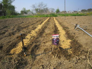 今回は種の蒔き方をスジ蒔きし、これを手のひらで軽く叩き種を固定してみた。 |