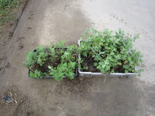 知人から譲り受けた菊苗。左、お花聞く。右、食用菊。2020.05.24 7:55 溝を切り仮置き。間隔は50センチ程度。2020.05.24 8:14