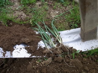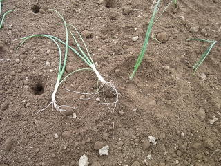 鍬の上のタマネギ苗。焼き鳥串程度の太さです。