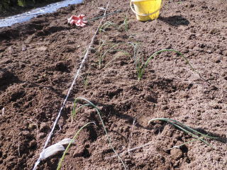 鍬左に見えるのがタマネギの苗。慎重に掘り超していきます。