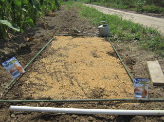土をかけ、角材で叩いて種と土を固定。もみ殻を蒔き作業完了。2020.08.30  12:30 雑草が目立ってきた。2020.09.13 9:36