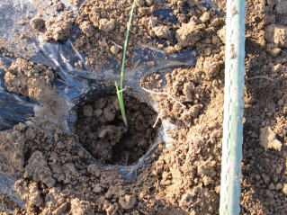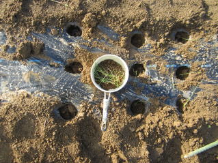 @穴開け器しい1畝3列、15〜20センチ間隔となるようにとなるように穴を開けていきます。
