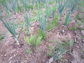 越冬直後のタマネギ。今年は暖冬。例年と雰囲気が違い、雑草がはびこっている。2020.04.04 13:36 雑草取りを待つ。2020.04.4.25 12:25